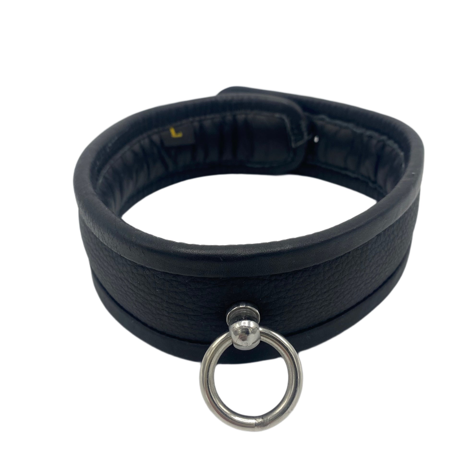 Halsbåndet er udført i læder og foran er der monteret en O-ring. Bagpå er der en stift, hvori der er plads til en lille hængelås.