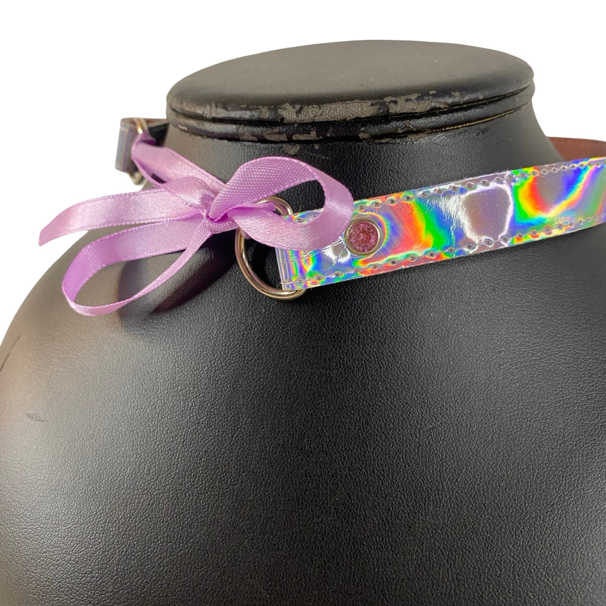 Håndlavet og unik choker med snørrelukning hvilket gør den justerbar i størrelse. Den er fremstillet med lyserød skind for og er således ikke vegansk. Overfladen er shiny sølv med regnbue nuancer og nitterne har lyserøde gems.
